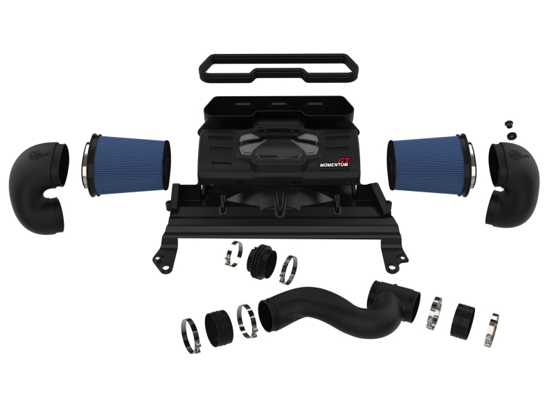 A pair of 360-degree radial flow air filters feature our pre-oiled Pro 5R media with five layers of progressively finer cotton gauze media for maximum performance. Our Pro 5R media provides your engine with the largest amount of high-flowing air, usually resulting in the highest power gains out of all other filter media options. This media is perfect for street use. The inverted tops make for more filter surface area, resulting in longer service intervals. Momentum’s innovative filter-to-housing interface was built to feature the largest air filter possible. Once the system is installed, the air filters can be easily removed from the housing for maintenance by only uninstalling the side intake tubes. The smooth one-piece sealed housing, constructed of heat-resistant cross-linked polyethylene (XLPE), features our patent pending filter-to-housing interface. Its innovative design minimizes the total number of parts, making for an easy installation. A massive clear sight window allows for hassle-free filter inspection without having to disassemble your intake system. The housing incorporates both the factory hood air inlet scoop and the grille inlet using no additional hardware. This system features a trio of high quality, computer-designed, dyno-tuned intake tubes to achieve maximum power gains while maintaining a perfect fit. Our XLPE material is heat soak resistant and extremely durable. Stainless-steel clamps are included for strength, and a premium silicone coupling allows for ample flexibility and durability. Momentum GT intakes are designed with fewer parts for a fast and easy installation.