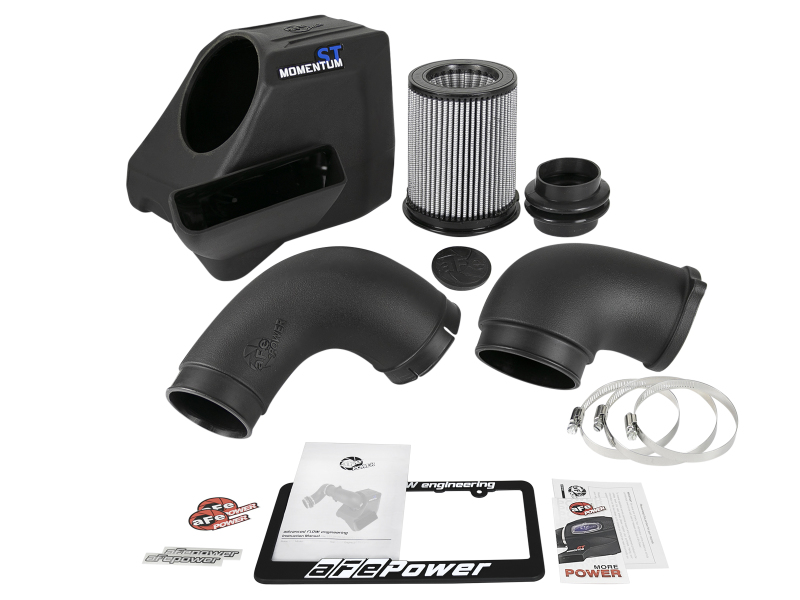 Unique One-Piece Sealed Housing: The smooth one-piece sealed housing with auxiliary air scoop is used to eliminate the use of multiple-piece housings and ensure the coldest air intake charge available. A urethane plug is also included if you wish to completely seal the auxiliary air scoop. High Quality Tube: This system uses a high quality plastic CAD designed, dyno-tuned, roto-molded intake tube to achieve maximum power gains while maintaining a perfect fit. Large 3-Layer Performance Air Filter: This Momentum ST intake system was designed around the largest filter possible to allow maximum performance and filtration. This cone filter has a massive round flange and is 8″ tall Pro DRY S filter media. The Pro DRY S performance air filter features 3-layers of progressive finer porosity synthetic media providing maximum convenience with 100% polyurethane frame for long life and multiple cleaning cycles. Premium Hardware: Premium stainless steel clamps and a silicone coupler at the throttle body is used for strength and durability whi le also providing the most secure installation available. Momentum ST intakes are designed with fewer parts for a quick and simple installation.