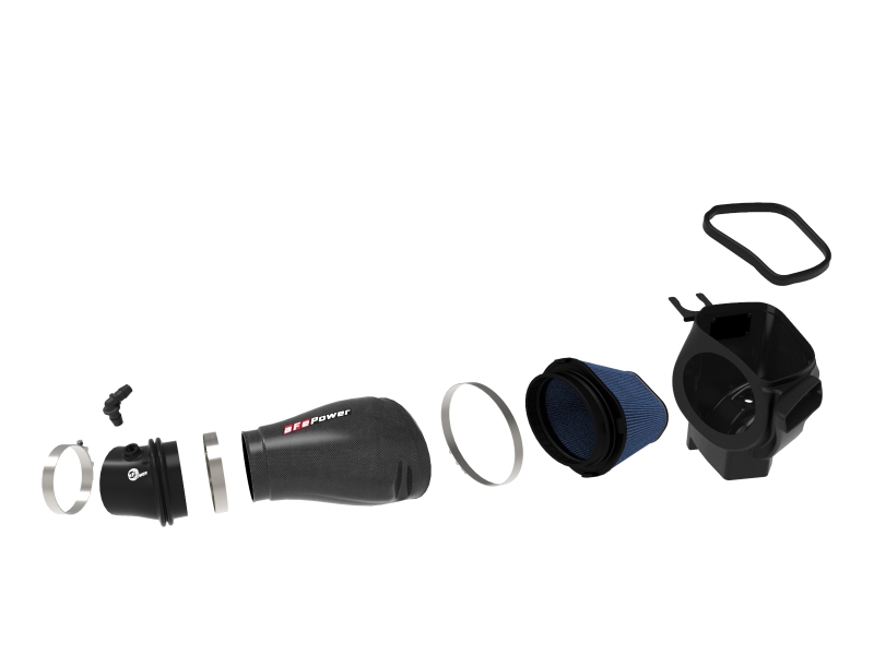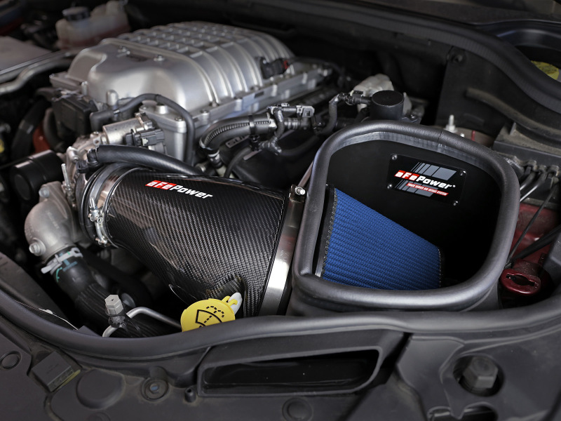 This 7” tall 360-degree radial flow air filter features a 5-1/2″ by 7-1/2″ flange and our pre-oiled Pro 5R media with five layers of progressively finer cotton gauze media for maximum performance. It provides your engine with the largest amount of high-flowing air and delivers the highest power gains in most cases. This media is perfect for street and/or track use. The included massive air filter is surrounded by an open-element XLPE (cross-linked polyethylene) polymer housing that minimizes warm engine air for maximum performance. Its open design allows for easy viewing of the air filter and delivers an aggressive Air Intake sound. Multiple air inlets bring in cool air when under power without capturing any warm air surrounding the engine. The factory MUA (Multi-Air Unit Actuator) is easily transferred to the aFe POWER housing to guarantee correct crankcase flow, avoiding check engine lights and damaging factory hoses and sensors. All hoses, clamps, and screws are provided to connect to the aFe POWER tube and secure the MUA to the aFe POWER housing. The lightweight tube is computer-designed to achieve maximum power gains while maintaining a perfect fit. Manufactured from 100% twill weave carbon fiber, it features zero fiberglass and is clear-coated for the highest quality construction. This is a direct fit intake system that utilizes factory mounting points. All necessary stainless-steel clamps, silicone coupling, and hardware are included. Its revolutionary design, featuring our patent pending filter-to-housing interface, uses half the number of parts of a traditional cold air intake system. For Dodge Durango SRT Hellcat models, the air filter sits right under the SRT hood vent. aFe Power recommends purchasing 28-10303 pre-filter to protect the air filter from rain and other elements. aFe Power strongly recommends avoiding pressure washing around the hood vent and driving under heavy rain.