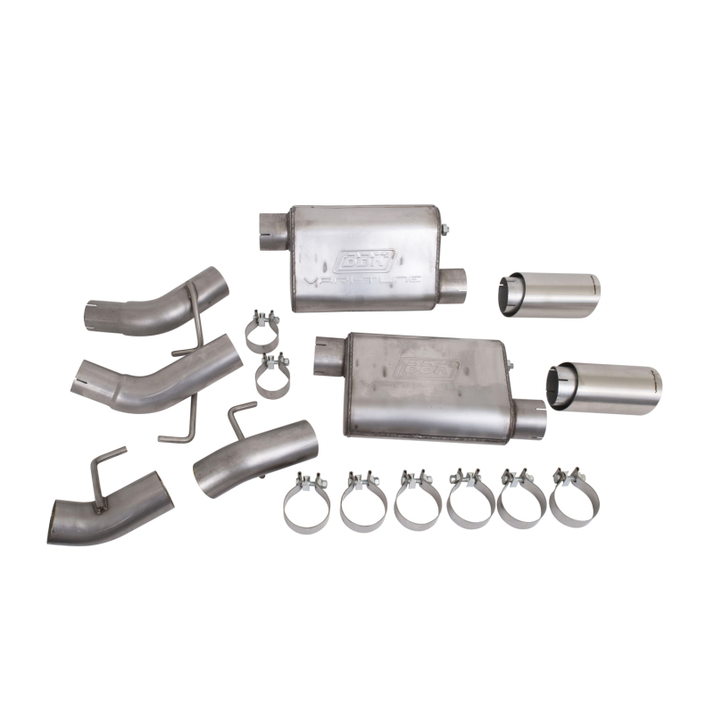 These new BBK Varitune axle back exhaust systems feature BBK Varitune mufflers that have a patented adjustable power valve inside that allows full adjustment of the exhaust flow through the mufflers chambers for a great sound and added performance. This adjustment is made at the rear of the muffler with a wrench by either moving the valve in or out. Once you are happy with the level of sound, it is locked in place with the Varitune locking nut. All of the Varitune power valves are made with stainless steel for lasting durability and smooth operation. These patented BBK Varitune exhaust systems allow you to personalize the power and sound levels of your car 8-10 decibels and 10-15 horsepower. All kits are available in 439 stainless steel and are offered as direct bolt on replacements for the restrictive factory exhaust. Every Varitune exhaust kit includes BBK Varitune laser etched logo 4 in. brushed stainless steel tips for impressive looks. Fits – 2010-2015 Camaro SS 6.2L LS3 & L99 Coupe Only