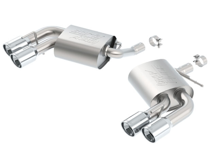 This Axle-Back system has Dual Tips on each muffler assembly and will fit vehicles with Dual Mode Exhaust (NPP) valves but it does NOT include Dual Mode Exhaust (NPP) valves. It may be used on vehicles that came from the factory with singe tips but you MUST change the rear bumper valance to accommodate the dual tips. Adapter Kit 60605 can be used to add NPP valves to this system. The system delivers the aggressive ATAK(r) sound with no drone inside the vehicle. System features a 2.25″ diameter inlet,1) 2.5″ tail pipe and 1) 2.75″ tail pipe, and dual 4″ round polished T-304 stainless steel tips on each muffler assembly. Borla(r) ATAK(r) (Acoustically Tuned Applied Kinetics) technology is designed for high-performance purists who prefer exhaust sound over their stereos. ATAK(r) equipped exhaust systems deliver the highest available dB (decibel) levels in the Borla(r) street-legal line-up… and unlike inferior brands that lose significant sound quality at higher volumes, ATAK(r) is tuned like a graphic equalizer to shape and focus sound waves for optimum high-volume output. ATAK(r) technology is based on specifically-tuned attributes of the internal muffler cores, which are calibrated on a vehicle-by-vehicle basis to deliver the most desirable sound. The power of Borla(r) Multicore technology, with the sound of vehicle-specific acoustic tuning. Each system is built from premium T-304 stainless steel, superior to T-400 series knockoffs (such as 409), to give you the absolute best in performance and durability. Ultra-smooth mandrel bends ensure maximum flow & power, and precision computer numerical control (CNC) manufacturing ensures an accurate fit. Best of all, Borla(r) stands behind every system with a Million-Mile Warranty. Just what you’d expect from the world’s most experienced (and most winning) exhaust brand.