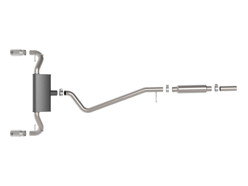 This cat-back exhaust system is constructed of 2-1/2 IN mandrel-bent 304 stainless steel tubing for maximum strength and durability. This system features a high-flow 304 stainless steel muffler, producing a throaty sound. Finishing off this exhaust system are dual 2-1/2 IN diameter polished 304 stainless steel clamp-on exhaust tips. The tips features a laser etched aFe POWER logo for a unique style. This system produces a throaty sound unleashing all available horsepower and torque. Cutting required, see instruction sheet for further information. Utilizing factory style hangers this system mounts directly to factory mounting locations for a hassle-free installation. State-of-the-art computer-aided design technology is utilized for precise vehicle fitment. 100% MIG-Welded for race-proven strength and durability.