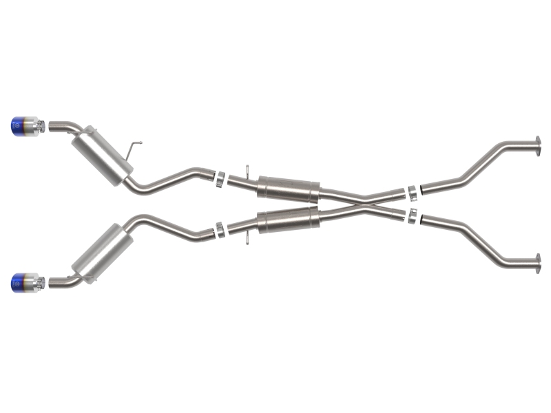 This cat-back exhaust system is constructed of 2-1/2 IN mandrel-bent brushed finished 304 stainless steel tubing for maximum strength and durability. This system features high-flow 304 stainless steel mufflers, producing a deep sound. The mufflers has a polished finish for ultimate corrosion resistance. Finishing off this exhaust system are dual 4-1/2 IN diameter blue flame 304 stainless steel clamp-on exhaust tips. The tips features a laser etched Takeda logo for a unique style. This system produces a deep sound unleashing all available horsepower and torque. Utilizing factory style flanges and hangers this system is a direct bolt-on system, which requires no cutting or modifications for a hassle-free installation. A mitered merge x-pipe is used to balance and evenly distribute exhaust pulses traveling through the exhaust system, minimizing exhaust drone and maximizing scavenging. State-of-the-art computer-aided design technology is utilized for precise vehicle fitment. 100% TIG-Welded for race-proven strength and durability..