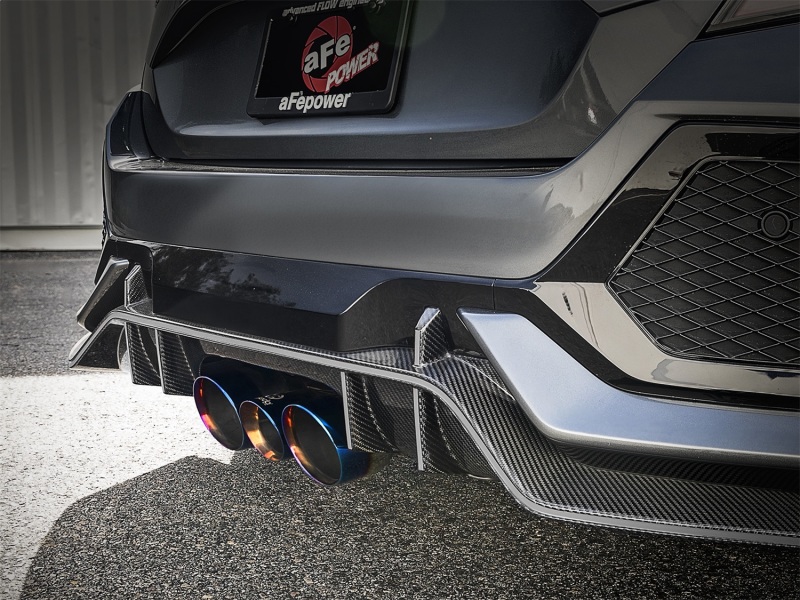 Even the latest-model sport compact vehicles have room for improvement and is why aFe POWER Takeda stainless steel cat-back exhaust system for the Honda Civic Type R L4-2.0L (t) engine is here to turn it up. In-house testing shows this Takeda exhaust system delivered gains of up to +19 HP/ +20 lbs. x ft. TQ and offers an aggressive growl under load! Constructed of 3″ into 2 ½” mandrel bent, brush finished, 304 stainless steel tubing for improved performance flow, corrosion resistance and overall breath-taking appearance, it is 100% hand TIG-welded by certified craftsmen for race proven strength and durability. This uniquely designed system incorporates a resonator, du al free-flowing 304 stainless steel mufflers and a center “open-pipe” to improve performance across the power band while maintaining a smooth, deep tone. Dual 4 ½” and single 3 ½” Tip (“Tri-Tip”) provides a track-ready, competitive look. Performance Gains: In house testing produced a max gain of +19 horsepower and +20 lbs. x ft. torque Brush Finished 304 Stainless Steel Construction: 3″ into 2 ½” brush finished, mandrel bent 304 stainless steel tubing for maximum performance, corrosion resistance, durability and overall appearance. Mitered Merge Collector: A mitered collector separates exh aust gases into three individual tubes. This decreases turbulence and increase exhaust velocity resulting in increased horsepower, torque and improved throttle response. Smooth, Deep, Aggressive Sound: Uniquely designed, dual free-flowing 304 stainless steel mufflers and a center “open-pipe” to unle ash horsepower and torque gains across the power band while producing a powerful, smooth, deep tone. Tri-Carbon Fiber Tips: This system features two 4 ½” and one 3 ½” double-wall exhaust tips. The tri-carbon Tip or “Tri-Tip” completes the form and function of this Takeda exhaust system for a styl ish and competitive look. TIG-Welded: 100% TIG-Welded by certified craftsmen for race proven strength