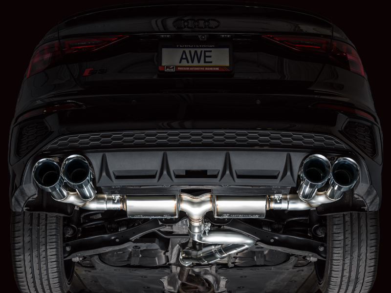 Introducing the first AWE Exhaust for the Audi S3 to ever feature patented drone-canceling 180 Technology®. The Touring Edition features a 3” inlet complete with an adapter to accommodate the factory downpipe perfectly while leaving an open 3” connection. In the rear resides AWE’s patented 180 Technology® resonators responsible for maintaining straight-through performance while decimating drone-prone frequencies. Thanks to the design and construction of 180 Technology® resonators, the internals will not break down and degrade over time causing tone change. Just full-bodied, drone-free rumble for life from the point of installation. This configuration provides the best ratio of interior refinement and exterior rumble on the market. No valves needed. Switch driving modes and the exhaust will render the same result as a vavled exhaust. It’s the do-it-all exhaust for every day drivers. Comes complete with quad 4.5″ slash-cut, double-walled tips in chrome silver. The AWE Touring Edition for the 8Y S3 is made in the USA and backed by AWE’s Fitment Guarantee, 50 state emissions compliance, No Check Engine Light Guarantee, and the AWE Lifetime Warranty.