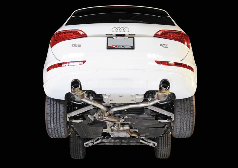 Perfect tone, unlocked power and uncompromised daily driving manners. For the Q5 2.0T, AWE knew the tone and volume had to be spot on, given the varied environments this do-it-all vehicle finds itself in. It needed to deliver an eye-opening wail at full throttle yet be quiet and civil during part throttle, around town driving. Countless research and development efforts by AWE’s Fabrication and Engineering Departments have yielded the finest Q5 2.0T exhaust on the market.The stock exhaust system is full of crimped tubing that hurts exhaust flow and robs horsepower. Our Q5 2.0T Exhaust was designed with smooth gradual bends and to eliminate any interruption to the flow of exhaust gasses. Our improvements to the exhaust path result in gains of +13 horsepower and +13 lb ft of torque at the crank. Replacing the large, restrictive factory mufflers also has a pleasing effect on the engine note. Our exhaust systems give the 2.0T a civilized, more melodious voice, with specific attention paid to low rpm situations at part throttle. Finishing it off This system is topped off with notable 3.5 inch slash-cut tips. The tips sport engraved AWE logos and are double walled to ensure a mirror polish, even under hard usage. Each tip is individually adjustable, so stagger and depth into bumper can be set according to personal taste.
