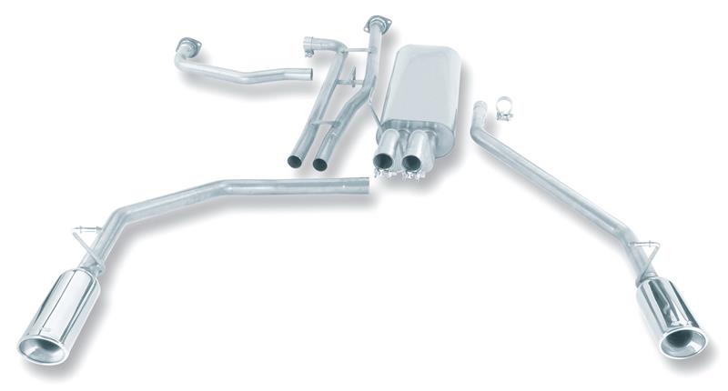 Borla(r) Performance Industries has designed a great total performance Cat-Back(tm) system for the 2004-2015 Nissan Titan V8 5.6L engine package (Part #140079). This system fits both the short bed crew cab and extended cab. Borla(r) R&D Engineers have designed this dual exhaust system as a true bolt-on for either 2 or 4 wheel drive, automatic or manual transmission models. System features polished T-304 stainless steel tips. Once again, Borla(r) technology produces a sound resembling a polite growl indicative of an old school big block while being tame enough for a cross country run. Muffler contains a H-Pipe for increased performance and improved sound. Weighs the same as the factory single system and flows 135cfm greater. This flow improvement accounts for the double digit horsepower increase and even greater potential if the engine is modified with induction upgrades because all Borla(r) exhaust is tuned to maximize the output of any aftermarket performance upgrade. Nissan has developed a great truck as their introduction to the American full sized pick-up market, and Borla(r) has complimented their efforts with a serious performance exhaust. Borla(r) Performance Industries, the original pioneers of premium, high-quality austenitic T-304 stainless steel (superior to 409 or aluminized steel) free-flow exhaust utilizes patented award and race winning technology to deliver quality, sound, performance gains and enhanced fuel economy all with an easy bolt-on installation. All Borla(r) street products carry an unsurpassed written million-mile warranty