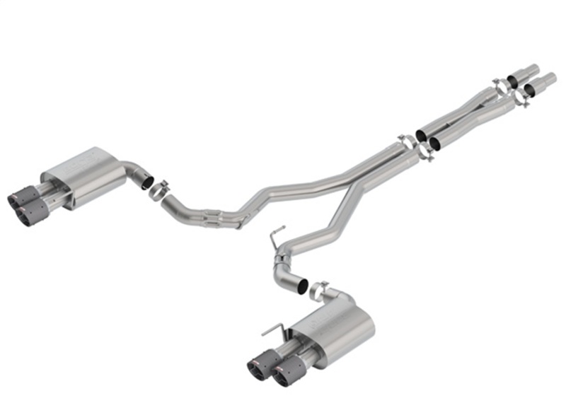 WITHOUT Active Valve Exhaust. NOT recommended for use on Convertibles. 3″ diameter system. System contains a merge X-Pipe for increased performance and improved sound. System features Borla(r)’s Polyphonic Harmonizer Technology which utilizes patented units that contain pipes of different diameters and lengths to create multiple exhaust notes that harmonize to deliver a clean, rich, full-bodied sound to the Borla(r) mufflers. The mufflers then enhance this sound to the character and volume appropriate for our Touring, S-Type and ATAK(r) systems. System also features 4″ carbon fiber tips with bright centers. Borla(r) Cat-Back(tm) and Axle-Back multi-core technology is designed to unleash hidden horsepower. Increased exhaust velocity adds power, driving excitement, fuel economy, and the distinctive Borla(r) Sound of Power respected by motoring enthusiasts everywhere. Each system is built from premium T-304 stainless steel, superior to T-400 series knockoffs (such as 409), to give you the absolute best in performance and durability. Ultra-smooth mandrel bends ensure maximum flow & power, and precision computer numerical control (CNC) manufacturing ensures an accurate fit. Best of all, Borla(r) stands behind every system with a Million-Mile Warranty. Just what you’d expect from the world’s most experienced (and most winning) exhaust brand.