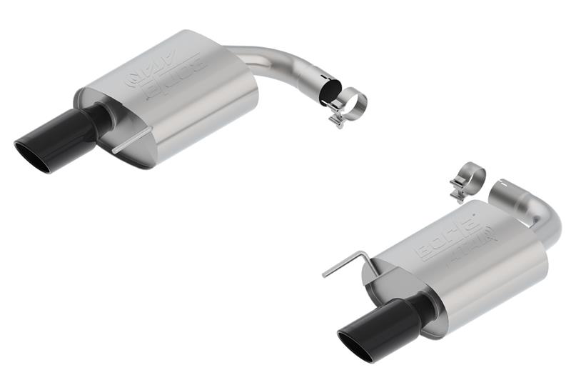 This 2.5″ diameter Axle-Back system features the aggressive ATAK(r) sound with no drone inside the vehicle. The exhaust exits through single 4″ round black chrome on T-304 stainless steel tips. on each muffler Using Borla(r) Stainless Steel Polish p# 21461 is NOT recommended with these black chrome tips. We suggest cleaning the tips with hot water and a microfiber cloth. A system with bright chrome on T-304 stainless steel tips is also available. By adding Borla(r) X-Pipe with Mid-Pipes part number 60705 you can create a Cat-Back(tm) system for your Mustang GT. Borla(r) Cat-Back(tm) and Axle-Back exhaust systems feature patented straight-through and multi-core technology designed to unleash hidden horsepower. Increased exhaust velocity adds power, driving excitement, fuel economy, and the distinctive Borla(r) Sound of Power respected by motoring enthusiasts everywhere. Each system is built from premium T-304 stainless steel, superior to T-400 series knockoffs (such as 409), to give you the absolute best in performance and durability. Ultra-smooth mandrel bends ensure maximum flow & power, and precision computer numerical control (CNC) manufacturing ensures an accurate fit. Best of all, Borla(r) stands behind every system with a Million-Mile Warranty. Just what you’d expect from the world’s most experienced (and most winning) exhaust brand.