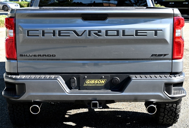 Made to last the new Chevy Silverado Gibson Exhaust Dual Split Rear Cat-Back System is here. For the enthusiast who wants an awesome look and aggressive throaty sound this Dual Split Cat back exhaust is for you. Gibson Exhaust Systems decrease backpressure and produce more torque and increased horsepower. Typical gains average of 18-20 horsepower. 4.0 in. Rolled Stainless Tips exit straight out the back. Works with most bumpers, roll pans and trailer hitches. Exhaust sound is louder under towing conditions. Easy bolt-on installation. No welding required. Includes stainless band clamps. Backed by a Lifetime Limited Warranty.