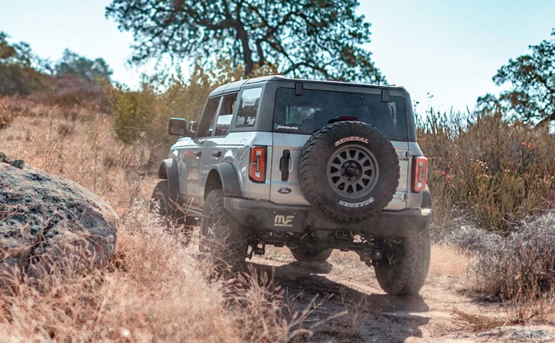 The MagnaFlow Ford Bronco Overland Series Cat-Back Performance Exhaust system #19559 is the perfect solution to further improve the off-road utility of your already-capable 2021-2023 Ford Bronco equipped with the 2.7L twin-turbo V6. This cat-back, direct-fit exhaust kit is designed to install easily and fit perfectly thanks to the hard work of the engineers at MagnaFlow’s Tech Center, who made detailed 3D scans of the entire vehicle in order to ensure perfect fitment. The advantage of such precise tolerances is that the entire performance exhaust system is mounted closer to the undercarriage of the vehicle than the stock system, resulting in significantly improved ground clearance. #19559 also features 3″ main piping that leads to a straight-through muffler before terminating in a single 2.5″ high-clearance side exit, which further improves the rear departure angle versus the standard tailpipe. The result of this upgrade is improved rock crawling capability and the ability to get out of tricky situations on the trail more easily. This Ford Bronco exhaust system utilizes a tunable NDT (No Drone Technology) quarter-wave resonator to eliminate unwanted noises at cruising speeds en route to your destination, with the added benefit of improving situational awareness when you’re out exploring or camping in the middle of nowhere. Exhaust kit #19559 is engineered to produce MagnaFlow’s deep signature exhaust tone at mild interior and moderate exterior sound levels, ideal for enjoying the character of your engine without scaring Mother Nature away. The exhaust system is built to last thanks to the use of precision CNC robotic manufacturing techniques and durable stainless-steel construction, all backed by MagnaFlow’s limited lifetime warranty.