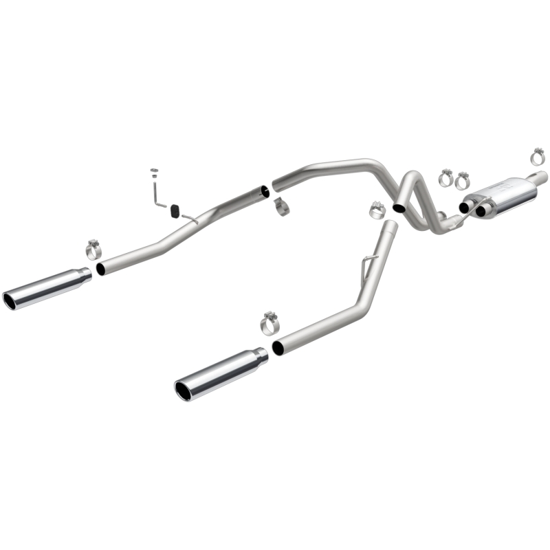 The MagnaFlow 2004-2005 Dodge Ram 1500 Street Series Cat-Back Performance Exhaust System brings out the personality of your 5.7L 2004-2005 Dodge Ram 1500 with our signature resonant, powerful engine tone and dyno-proven performance. Thanks to its fast-flowing, mandrel bent 2.5in. main piping and 1 Straight-Through mufflers ending in a Dual Split Rear exit with 3.5in. Polished Clamp-On Single Wall Angle Cut Rolled Edge tips, this Dodge Ram 1500 exhaust kit has the performance chops to match its sporty sound and appearance. Upgrade your ride to the next level with an exhaust that has the pipes to put other Dodge Ram 1500’s to shame. With this system your vehicle will be producing Aggressive exterior and Moderate interior sound levels while leaving other cars and trucks feeling envious at every stoplight. Exhaust kit 15863 features a cat-back layout that replaces your ride’s stock exhaust components from near the catalytic converter on back. Extensive 3D scanning during development has resulted in a direct-fit design that you can easily install yourself. 15863 is produced using CNC precision robotic manufacturing techniques and is backed by MagnaFlow’s 1-year limited finish warranty and limited lifetime construction warranty.