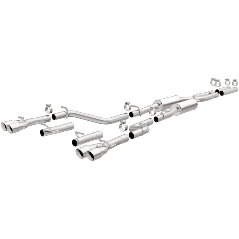The MagnaFlow 2015-2023 Dodge Challenger Competition Series Cat-Back Performance Exhaust System 19217 brings an aggressive, attention-grabbing edge to the deep resonant exhaust note we’re so well known for. This exhaust kit is designed to enhance your 3.6L 2015-2023 Dodge Challenger with dyno-proven performance made possible thanks to fast-flowing mandrel bent 2.5in. main piping and 2 Straight-Through mufflers ending in a Quad Split Rear exit with 3.5in. Polished Welded-On Double Wall Angle Cut Folded Edge tips featuring a sporty finish. The exhaust system’s cat-back layout replaces your ride’s exhaust system from near the catalytic converter on back. Exhaust system 19217 is engineered to make your vehicle’s engine produce Aggressive exterior and Moderate interior sound levels, befitting its competition-oriented design. 19217’s direct-fit design makes installation a breeze thanks to the use of advanced 3D scanning techniques. This performance exhaust system is made of 100% durable and corrosion-resistant stainless steel and produced using CNC precision robotic manufacturing, all backed by MagnaFlow’s limited lifetime warranty. Please check to ensure compliance with local noise regulations.