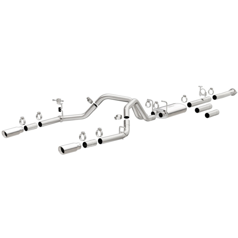 The MagnaFlow Street Series Cat-Back Performance Exhaust System 19027 brings out the personality of your Truck with our signature resonant, powerful engine tone and dyno-proven performance. Thanks to its fast-flowing, mandrel bent 3.5in. main piping and 1 Straight-Through mufflers ending in a Dual Split Rear exit with 4in. Polished Clamp-On Double Wall Angle Cut Rolled Edge tips, this Truck exhaust kit has the performance chops to match its sporty sound and appearance. Upgrade your ride to the next level with an exhaust that has the pipes to put other Truck’s to shame. With this system your vehicle will be producing Aggressive exterior and Moderate interior sound levels while leaving other cars and trucks feeling envious at every stoplight. Exhaust kit 19027 features a cat-back layout that replaces your ride’s stock exhaust components from near the catalytic converter on back. Extensive 3D scanning during development has resulted in a direct-fit design that you can easily install yourself. 19027 is produced using CNC precision robotic manufacturing techniques and is backed by MagnaFlow’s 1-year limited finish warranty and limited lifetime construction warranty.