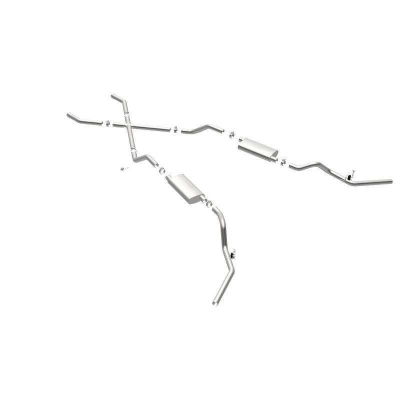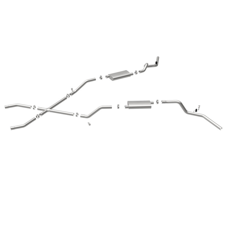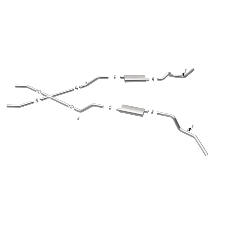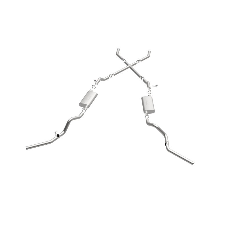 The MagnaFlow Street Series Crossmember-Back Performance Exhaust System 16643 brings enhanced engine sound and dyno-proven performance to your 3.8L, 4.1L, 4.3L, 4.6L, 4.8L, 5.0L, 5.3L, 5.7L, 6.5L, 6.6L 1960-1972 Chevrolet with a healthy helping of our deep, resonant signature exhaust note at Aggressive exterior and Moderate interior sound levels. Thanks to its durable, corrosion resistant stainless steel design, this Chevrolet exhaust system will handle whatever tarmac you decide to leave your mark on. This performance exhaust kit features a crossmember-back layout designed to replace your Chevrolet’s exhaust system from the crossmember on back. With its fast-flowing, mandrel bent 2.5in. main piping and 2 Straight-Through mufflers ending in a Dual Split Rear Behind Rear Tires exit that you can enhance with tips of your choosing, your muscle car will be sounding as awesome as it looks. Extensive 3D scanning during development has resulted in a direct-fit design that you can easily install yourself. 16643 is produced using CNC precision robotic manufacturing techniques and is backed by MagnaFlow’s limited lifetime construction warranty.