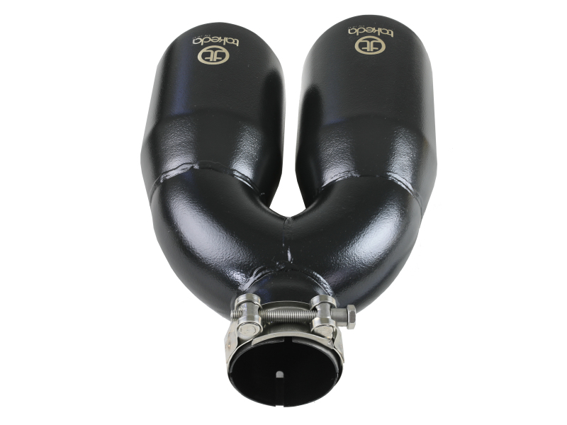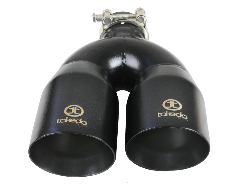 Improve your exhaust system by upgrading your exhaust tip with this Takeda 304 stainless steel, universal tip designed to fit most 2 1/2″ exhaust systems. This 12” long, double-walled, slash cut black tip has a laser-etched Takeda logo for a custom look. Completely adjustable, the tip includes a quality stainless steel barrel band clamp for a secure fit and there is no modification or welding required. This direct-fit clamp-on tip is constructed from 304 stainless steel and features a black finish for corrosion resistance for long lasting good looks. This tip features a Takeda logo for an aggressive, custom look. A high quality stainless steel clamp is used for a complete 360 degree sealing surface. Designed to fit 2-1/2″ exhaust systems; 2-1/2″ inlet x dual staggered 4″ outlet and 12″ inch length. Right side applications.