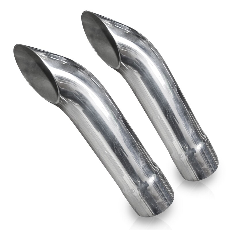 Polished pair of 304 stainless steel, Extended turn down style tip, 2-1/4″ body, 2-1/4″ ID inlet with a overall length of 11″.