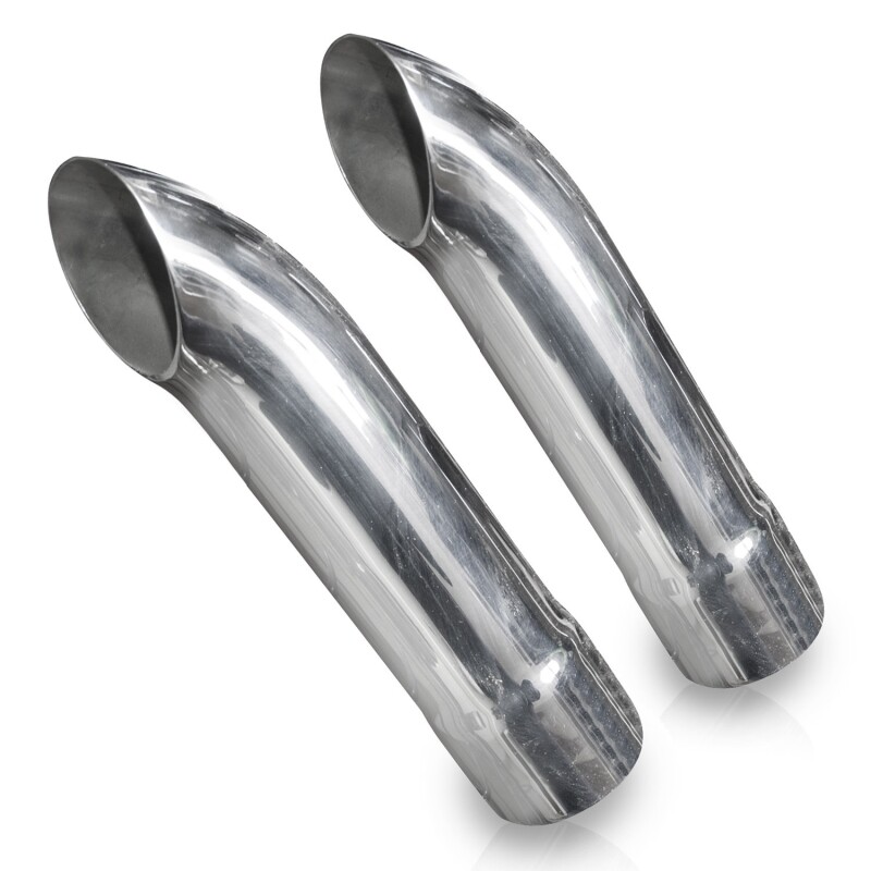 Pair of Short turn down tips, with 2-1/2″ ID inlet, 2-1/2″ diameter body with an overall length of 11″ Can be clamped or welded in place. Made from 304 stainless steel for maximum corrosion resistance. Hand mirror polished finish. The quality of our tips is far superior to the less expensive tips on the market. These kits come with a lifetime warranty and proudly made in the USA.