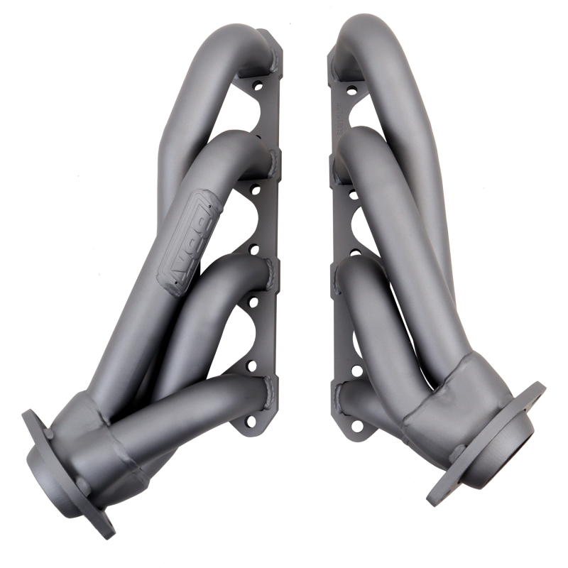 These BBK Performance shorty unequal Length exhaust Headers are designed and constructed with 1-5/8 in. CNC mandrel bent tubing that offers unrestricted exhaust flow for increased horsepower and torque over factory OEM manifolds. As with all BBK Performance exhaust headers they feature a 3/8 in. laser cut flange for additional strength and a guaranteed leak free fit. All headers are robotically and precision hand welded and then pressure tested to ensure years of reliability and performance in the real world. All BBK exhaust headers are available in a titanium ceramic or polished silver ceramic coated finish and include new exhaust header gaskets, header bolts and hardware to complete the installation.