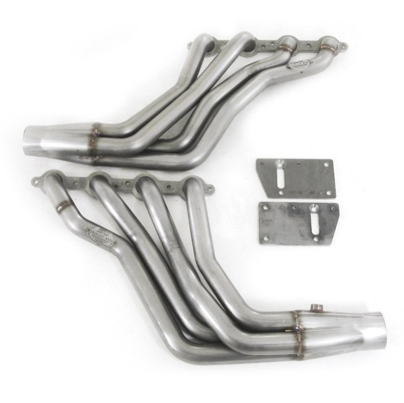 1962-67 Chevy II Nova LS1 All tubes are CNC mandrel bent for optimal flow. Made from 304 stainless steel for maximum corrosion resistance. 3/8″ CNC laser cut flanges. These headers come with 1-3/4″ primaries into 3″ slip-fit collectors. Fits car with Church Boys Rack and Pinion Steering. Steel Motor Mount adapters are included for use with stock motor mounts in neutral position. Collectors fit up nicely above the oil pan and direct the exhaust back to allow dual 3″ dia. tubes to clear the transmission cross member. Mill finish, All TIG welded for strength and durability. These kits come with a lifetime warranty and proudly made in the USA.